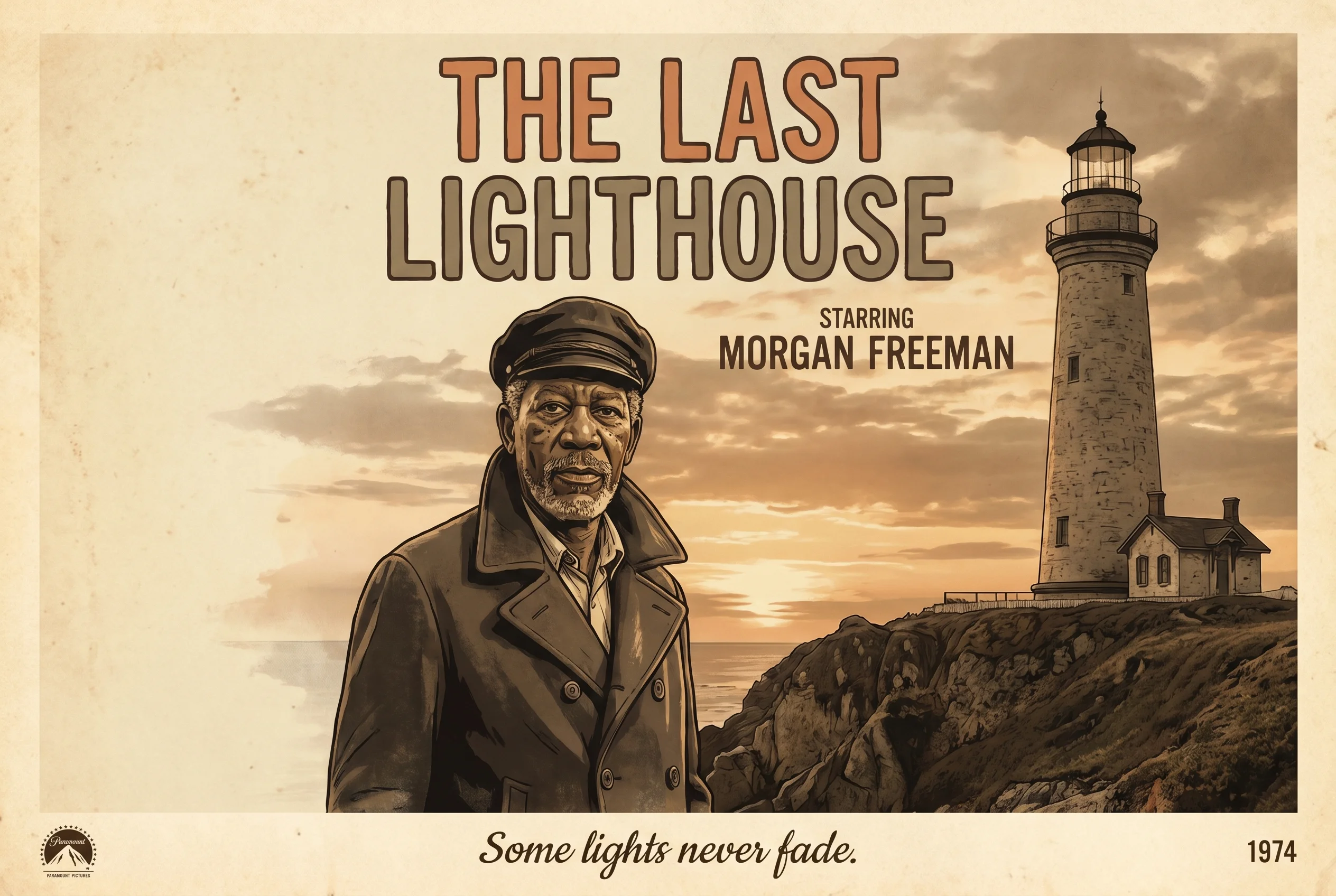 Prompt: A vintage movie poster for a film called 'THE LAST LIGHTHOUSE' starring Morgan Freeman, with the tagline 'Some lights never fade' at the bottom, 1970s aesthetic