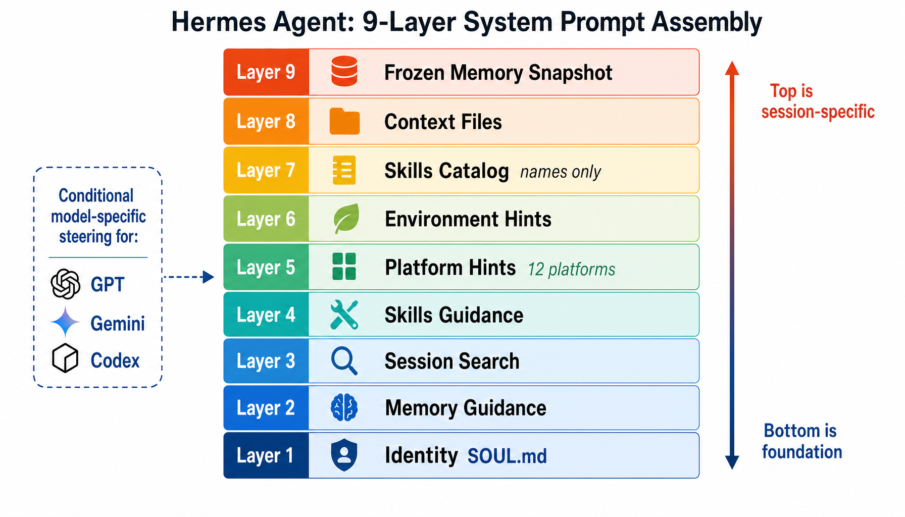 Hermes builds its system prompt from 9 layers, each adding specific context. Think of it as building a layered briefing document — each layer contributes something essential: